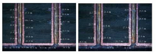 測試板成品量測所有電阻均合格,說明板電銅厚控制21+/-3um、成品銅厚控制均值35um到40多um,線寬控制在0.19到0.21之間,成品電阻合格。且蝕刻后的半成品電阻比成品的電阻大1.5Ω左右。故蝕刻量測電阻理論上應(yīng)做1.5Ω的預(yù)大。預(yù)大與PCB的設(shè)計和阻焊和表面處理流程帶來的差異有相當大的關(guān)系,不同PCB蝕刻后的電阻預(yù)大需要考慮到這些因素。