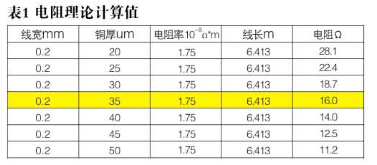 6413mm長,0.2mm寬的銅導(dǎo)線在不同銅厚下的電阻理論計算值如下表。R=ρ*L/S,ρ為材料電阻率 1.75*10-8Ω*m,L為導(dǎo)線長度6413mm,S為導(dǎo)線橫 截面積,實際電阻上下限分別為:17.6Ω和14.4Ω。 理論計算當銅厚在35um時,0.2mm寬6413mm長的導(dǎo)線才能達到理想電阻值16Ω。