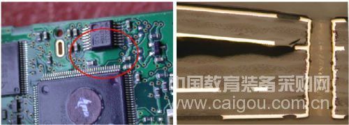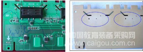 該批樣品為CEM1 類型板材,無鉛回流焊后發(fā)生爆板失效,概率達(dá)3%左右,樣品呈長條型,其中有一排較大地電磁繼電器(見圖1)。爆板的區(qū)域集中在元器件分布少的部位,且該部位和對(duì)應(yīng)的背面的顏色較黃,顏色較其他部位要明顯深(圖2)。通過切片分析發(fā)現(xiàn),爆板發(fā)生的區(qū)域內(nèi)部PCB 基材分層在紙質(zhì)層。用近似批次的樣板按照進(jìn)行熱應(yīng)力試驗(yàn),在260℃下由10 秒到30 秒都沒有發(fā)現(xiàn)類似的爆板失效,試驗(yàn)后的樣品的顏色也沒有實(shí)際失效的樣品深。同時(shí)用熱分析方法(TGA 和DSC)對(duì)爆板區(qū)域的材質(zhì)進(jìn)行,發(fā)現(xiàn)該材質(zhì)的熱分解溫度和玻璃態(tài)轉(zhuǎn)化溫度均符合材質(zhì)的技術(shù)規(guī)范。根據(jù)以上分析,可以推斷該無鉛回流焊組裝工藝的條件超出了該類型PCB 的技術(shù)要求,回流時(shí)為了保證吸熱的大器件的焊點(diǎn)合格或良好,設(shè)置的工藝參數(shù)主要是焊接的溫度與時(shí)間過高過長,導(dǎo)致元器件少或空白的區(qū)域局部溫度超過該類型板材的技術(shù)規(guī)范,終導(dǎo)致產(chǎn)品爆板失效。該失效與板材本身無關(guān),而與材質(zhì)的選用、設(shè)計(jì)以及焊接工藝有關(guān)。