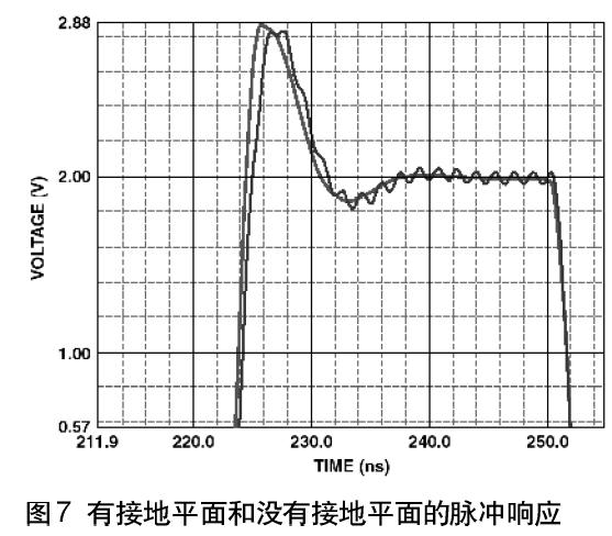 圖7中的振蕩示出了高速運(yùn)算放大器同相輸入端長度為2.54 cm的印制線的影響。其等效寄生電感為29 nH(10-9H),足以造成持續(xù)的低壓振蕩,會持續(xù)到整個瞬態(tài)響應(yīng)周期。圖7還示出了如何利用接地平面來減小寄生電感的影響。