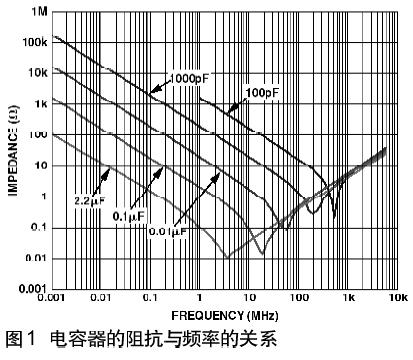 并聯(lián)不同的電容值的電容器有助于確保電源引腳在很寬的頻帶上只能看到很低的交流(AC)阻抗。這對于在運(yùn)算放大器電源抑制比(PSR)衰減頻率處尤其重要。該電容器有助于補(bǔ)償放大器降低的PSR。在許多十倍頻程范圍內(nèi)保持低阻抗的接地通路將有助于確保有害的噪聲不能進(jìn)入運(yùn)算放大器。圖1示出了采用多個并聯(lián)電容器的優(yōu)點(diǎn)。在低頻段,大的電容器提供低阻抗的接地通路。但是一旦頻率達(dá)到了它們自身的諧振頻率,電容器的容性就會減弱,并且逐漸呈現(xiàn)出感性。這就是為什么采用多個電容器是很重要的原因:當(dāng)一個電容器的頻率響應(yīng)開始下降時,另一個電容器的頻率響應(yīng)開始起作用,所以能在許多十倍頻程范圍內(nèi)保持很低的AC阻抗。