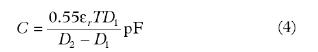 當(dāng)尋找有問題的寄生源時,可能用得著幾個計(jì)算上述那些寄生電容尺寸的基本公式。公式(1)是計(jì)算平行極板電容器(見圖5)的公式。