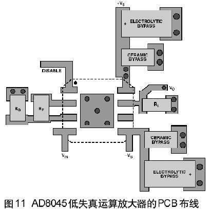 低失真引腳排列允許輸出引腳(專用反饋引腳)和反相輸入引腳之間可以靠近連接,如圖11所示。這樣極大地簡化和改善了布線。