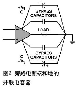 直接從運(yùn)算放大器的電源引腳入手;具有小電容值和小物理尺寸的電容器應(yīng)當(dāng)與運(yùn)算放大器置于PCB的同一面――而且盡可能靠近放大器。電容器的接地端應(yīng)該用短的引腳或印制線直接連至接地平面。上述的接地連接應(yīng)該盡可能靠近放大器的負(fù)載端以便減小電源端和接地端之間的干擾。圖2示出了這種連接方法。