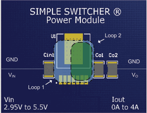 在規(guī)劃電源布局時(shí),首先要考慮的是兩個(gè)開關(guān)電流環(huán)路的物理環(huán)路區(qū)域。雖然在電源模塊中這些環(huán)路區(qū)域基本看不見,但是了解這兩個(gè)環(huán)路各自的電流路徑仍很重要,因?yàn)樗鼈儠?huì)延至模塊以外。在圖1所示的環(huán)路1中,電流自導(dǎo)通的輸入旁路電容器(Cin1),在高端MOSFET的持續(xù)導(dǎo)通時(shí)間內(nèi)經(jīng)該MOSFET,到達(dá)內(nèi)部電感器和輸出旁路電容器(CO1),后返回輸入旁路電容器。