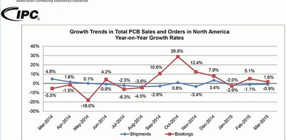 2015年4月29日,美伊利諾伊州班諾克本 — IPC — 際電子工業(yè)聯(lián)接協(xié)會發(fā)布《3月份北美地區(qū)PCB行業(yè)調(diào)研統(tǒng)計報告》。報告顯示3月份銷售雖然低迷,但是訂單量超過去年同期水平,致使訂單出貨比穩(wěn)定在1.05。