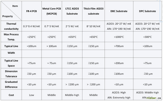 目前市場(chǎng)上廣泛使用的電路板類型如下表一所示,其中陶瓷基板其高導(dǎo)熱系數(shù)、高線路解析度、低累進(jìn)公差、及允許打線工藝與直接共晶工藝等特性皆優(yōu)于FR-4 PCB與MCPCB。但是,陶瓷基板并非皆具有相同的特性,因工藝與材料的差異,陶瓷基板因而可分類為:低溫共燒陶瓷(LTCC, Low-Temperature Co-fire Ceramics)基板、厚膜(Thick-Film)陶瓷基板、DBC (Direct Bonding Copper)陶瓷基板與DPC (Direct Plating Copper)陶瓷基板,其中DPC陶瓷基板又可稱為薄膜(Thin-Film)陶瓷基板。