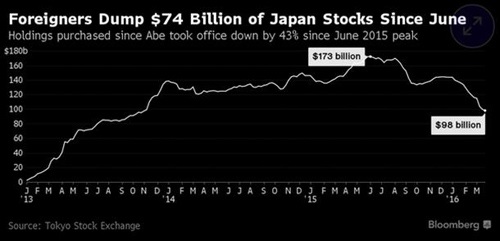 出于對(duì)安倍經(jīng)濟(jì)學(xué)以及日本經(jīng)濟(jì)前景的悲觀態(tài)度,彭博數(shù)據(jù)顯示,今年來交易員撤走了460億美元的資金,投資者已經(jīng)連續(xù)十三周拋售日本股票,創(chuàng)1998年以來長連跌紀(jì)錄。東證指數(shù)下跌17%,這一表現(xiàn)之差僅次于意大利。