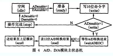 系統(tǒng)設(shè)計中,將AD、DA操作封裝成一單獨模塊,由上層控制模塊輸出命令字及控制信號啟動本模塊的相應(yīng)操作,操作完成后(進入idle狀態(tài)) ,本模塊發(fā)出相應(yīng)狀態(tài)信號至上層模塊。