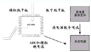用分離地平板對于10位ADC的50MSPS和12位ADC的30~35MSPS工作良好。超出此范圍,額外的電路噪聲是明顯的,而且分離的地平板也可引起信號輻射。當(dāng)線承載電流信號時(shí),會在跨越平板間分離處發(fā)生問題。