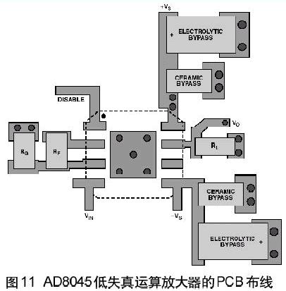 低失真引腳排列允許輸出引腳(專用反饋引腳)和反相輸入引腳之間可以靠近連接,如圖11所示。這樣極大地簡(jiǎn)化和改善了布線。杭州PCB|杭州smt