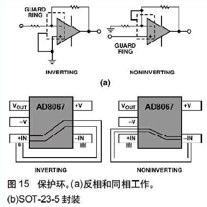 保護(hù)環(huán),或者說“隔離環(huán)”,是運(yùn)算放大器常用的另一種屏蔽方法,它用于防止寄生電流進(jìn)入敏感結(jié)點(diǎn)。其基本原理很簡(jiǎn)單——用一條保護(hù)導(dǎo)線將敏感結(jié)點(diǎn)完全包圍起來,導(dǎo)線保持或者迫使它保持(低阻抗)與敏感結(jié)點(diǎn)相同的電勢(shì),因此使吸收的寄生電流遠(yuǎn)離了敏感結(jié)點(diǎn)。圖15(a)示出了用于運(yùn)算放大器反相配置和同相配置中的保護(hù)環(huán)的原理圖。圖15(b)示出用于SOT-23-5封裝中兩種保護(hù)環(huán)的典型布線方法。