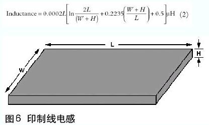 式(2)示出了計算印制線電感(Inductance)的公式。參見圖6。