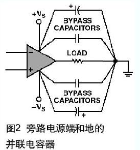 直接從運算放大器的電源引腳入手;具有小電容值和小物理尺寸的電容器應(yīng)當與運算放大器置于PCB的同一面——而且盡可能靠近放大器。電容器的接地端應(yīng)該用短的引腳或印制線直接連至接地平面。上述的接地連接應(yīng)該盡可能靠近放大器的負載端以便減小電源端和接地端之間的干擾。圖2示出了這種連接方法。