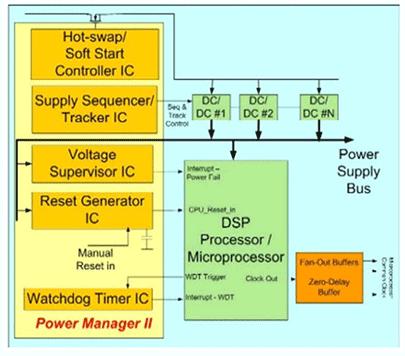 在本文中,電源管理被簡單定義為:對PCB上的全部電源實施管理(包括:DC-DC轉換器、LDO等)。電源管理包括如下功能:管理PCB上DC-DC控制器。例如,熱插拔、軟啟動、排序、追蹤、容限和規(guī)整;生成全部相關的電源狀態(tài)和控制邏輯信號。例如,復位信號生成、電源故障指示(監(jiān)控)和電壓管理。圖1演示了一個采用CPU或微處理器的PCB上的典型電源管理功能;熱插拔/軟啟動控制功能用于限制浪涌電流以減小電源的啟動負載。對插入有源(live)基板的PCB來說,這是個重要功能;電源排序和跟蹤功能用于在滿足PCB上的全部器件對上電順序要求的前提下,控制如何開/關多個電源。對所有電壓進行故障(過/欠壓)監(jiān)測以向處理器就即將發(fā)生的電源故障進行預警。該功能也被稱為“監(jiān)管功能”。