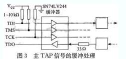 為保證信號(hào)的完整性,本文對(duì)來自測(cè)試裝置的主TAP控制信號(hào)進(jìn)行了緩沖處理,同時(shí)用上拉電阻將TDI、TMS信號(hào)拉至邏輯1狀態(tài),將TCK下拉接地。另外,在后一個(gè)器件的TDO和被測(cè)板的TDO端口之間放置一個(gè)20 Ω的電阻以衰減反射。緩沖器類型的選用要參考電路板上器件的電平類型。如圖3所示,被測(cè)板上邊界掃描器件工作電壓為3.3 V,本文選用的緩沖器SN74LV244的工作電壓為2.7 V~5.5 V,可以滿足需要。