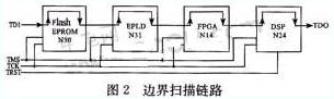 在此目標(biāo)板上,我們將Flash EPROM(N30)、DSP(N31)、EPLD(N14)和FPGA(N24)依次連接起來,成為一個(gè)完整的掃描鏈路。TAP控制信號(hào)(TCK、TMS、TRST*)并聯(lián),前一器件的TDO和后一器件的TDI依次連接成鏈。其中只有DSP有TRST*信號(hào)。對(duì)于TRST*信號(hào),因?yàn)樗堑碗娖接行?,若在器件?nèi)部或者電路板上已經(jīng)上拉,則在測(cè)試時(shí)可以不加以控制。而在該目標(biāo)板的DSP內(nèi)部此引腳處于下拉狀態(tài),為使其進(jìn)人邊界掃描狀態(tài),必須外加激勵(lì)信號(hào),因此本文把它單獨(dú)引出來。如圖2所示。