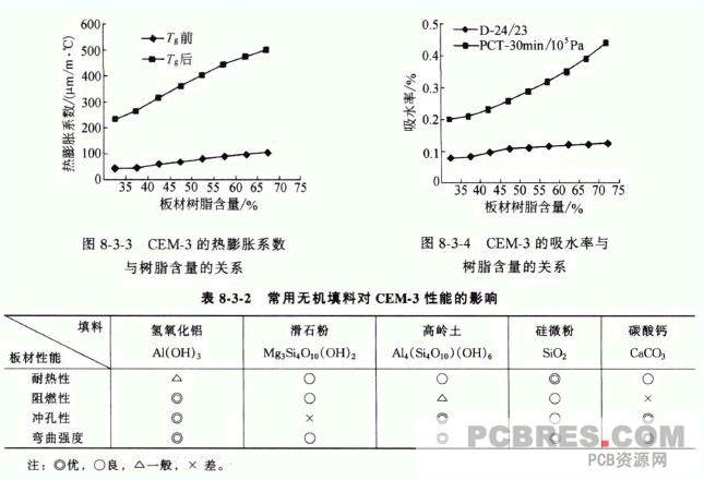(3)無機填料無機填料是CEM-3 的重要組分之一,作為填充劑,它直接影響板材的尺寸穩(wěn)定性、通孔可靠性、耐潮濕性和機械加工性等。初的CEM-3 不含有無機填料,玻纖紙的含膠量大,使到板材有機物(環(huán)氧樹脂固化物)含量高達60% ,導致板材熱膨脹數(shù)和吸水率偏大,然而早期CEM-3 主要用于單面印制線路板,不需考慮通孔可靠性,耐潮濕性即使差一點,問題也不大;隨著CEM-3 應用范圍的擴大,特別是在雙面印制線路板上的應用,這些問題就暴露出來。后來,通過在芯料用膠液中加入無機填料,大大提高CEM-3的無機物比例,使板材中有機物含量和無機物含量的比例下降為40: 60 (質(zhì)量份) ,接近FR-4 水平,顯著地降低板材的熱膨脹系數(shù)和吸水率,圖8-3-3 、圖8-3-4 顯示了CEM-3 的樹脂含量(即有機物含量,通過無機填料用量來調(diào)整)與板材熱膨脹系數(shù)、吸水率的關系。CEM-3 常用的元機填料有氫氧化鋁、滑石粉、碳酸鈣、硅微粉、高嶺土等,它們對CEM-3 性能的影響見表8-3-2 。目前CEM-3 大量使用的無機填料是氫氧化鋁,氫氧化鋁含有3 個結晶水,在200 - 500 C條件下,不同程度釋放出水,在釋放水時,需吸收大量的熱量,所以氫氧化鋁也是一種理想的"潔凈"阻燃劑,氫氧化鋁的粒徑越小,阻燃效果越好;但是,氫氧化鋁會影響板材的耐熱性、耐浸焊性, PCB 加工熱風整平、元件焊接的溫度都接近氫氧化鋁的分解溫度,如果時間較長,高溫下氫氧化鋁受熱分解,板材會分層起泡;近年有廠家研究對氫氧化鋁進行熱處理,脫去部分在200 多度開始分解的結晶水,可大大提高氫氧化鋁的熱分解溫度,這種含有1. 8-2.9 個結晶水的氫氧化鋁已開始供應市場。