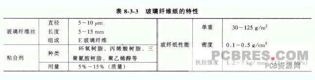 (5) 增強材料CEM-3 采用電子級玻璃纖維布和電子級玻璃纖維紙兩種增強材料。面料的增強材料一般用7628 玻璃纖維布,對一些特殊用途的CEM-3 也采用2116 玻纖布,但會增加產(chǎn)品成本。玻纖布和玻纖紙必須經(jīng)過硅烷偶聯(lián)劑表面處理,以提高耐潮濕性、耐熱性、電氣絕緣性。玻纖紙的強度較低和內(nèi)應力很小,其對板材翹曲影響較小,而玻纖布存在編織張力及內(nèi)應力殘留、經(jīng)緯紗偏斜等不穩(wěn)定因素,對CEM-3 翹曲影響較大,因此,必須注意玻纖布的經(jīng)、緯紗的編織密度、緯斜等,同時,生產(chǎn)CEM-3 時須注意面料要同機同布。芯料的增強材料采用玻璃纖維紙(簡稱玻纖紙,又稱玻璃纖維無紡布、玻璃纖維氈、玻璃紙等) ,它由短切玻纖、粘合劑,用濕式短網(wǎng)抄紙機按抄紙方法制成,其特性見表8-3-3 。CEM-3 用玻纖紙一般以綜合性能好的環(huán)氧樹脂或丙烯酸樹脂為粘合劑;用聚乙烯醇作粘合劑的玻纖紙,雖然價格便宜,但是耐熱性、耐水性差,已被淘汰出CEM-3 用玻纖紙之列。