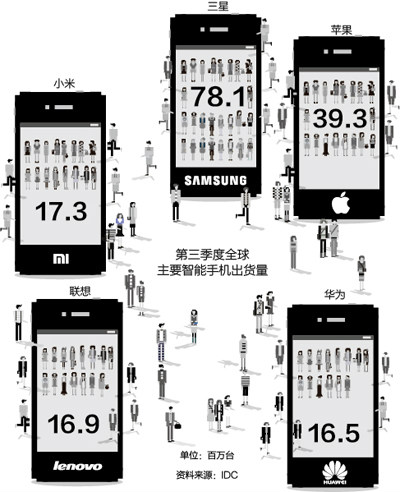 中手機(jī)廠商正在集體向全球三的位置發(fā)起沖擊。 10月30日,IDC發(fā)布研究報告稱,三季度全球智能手機(jī)出貨量為3.276億部,較去年同期的2.617億部增長25.2%,其中三星和蘋果位居前兩位,緊隨其后的是小米、聯(lián)想和LG。而在今年上半年,三名還是華為,LG和聯(lián)想分列四、五。
