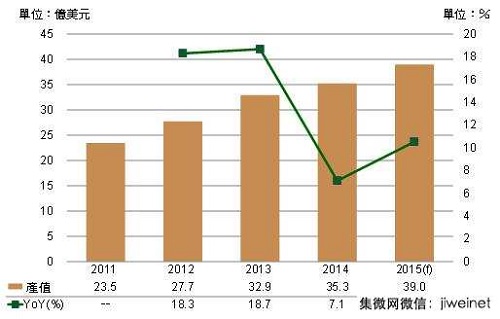 雖自2011年以來,全球智慧型手機出貨量年成長率即呈現(xiàn)逐年下滑態(tài)勢,但2015年預(yù)估仍能維持2位數(shù)年成長幅度,加上來自大陸IC內(nèi)需市場規(guī)模亦持續(xù)成長,使得同期大陸IC設(shè)計業(yè)產(chǎn)值仍將能維持20%以上的成長動能。在大陸IC設(shè)計產(chǎn)業(yè)強勁成長帶動下,DIGITIMESResearch預(yù)估,2015年大陸晶圓代工產(chǎn)業(yè)產(chǎn)值將達(dá)39億美元,較2014年成長10.5%。