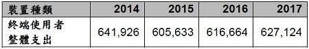 2014~2017年全球終端使用者設(shè)備支出(單位:百萬(wàn)美元)