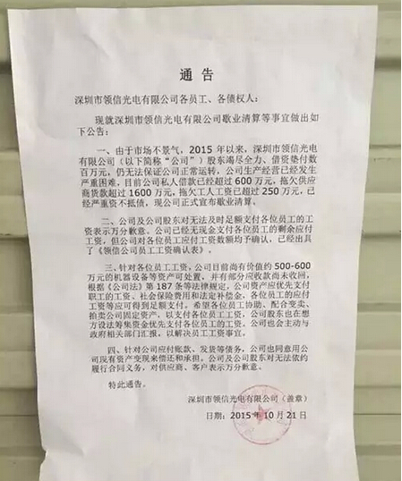 據(jù)領(lǐng)信光電貼出來的歇業(yè)清算通告顯示,拖欠供應(yīng)商款項逾1600萬元,同時公司負責人還私人借款逾600萬,拖欠員工工資也達250多萬元。